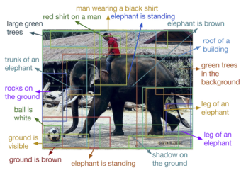 Output of DenseCap "dense captioning" software, analysing a photograph of a man riding an elephant