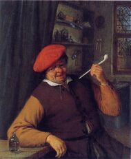 The earliest depictions of smoking can be found on Classical Mayan pottery from around the 9th century. The art was primarily religious in nature and depicted deities or rulers smoking early forms of cigarettes.[109] Soon after smoking was introduced outside of the Americas it began appearing in painting in Europe and Asia. The painters of the Dutch Golden Age were among the first to paint portraits of people smoking and still lifes of pipes and tobacco. For southern European painters of the 17th century, a pipe was much too modern to include in the preferred motifs inspired by mythology from Greek and Roman antiquity. At first smoking was considered lowly and was associated with peasants.[110] Many early paintings were of scenes set in taverns or brothels. Later, as the Dutch Republic rose to considerable power and wealth, smoking became more common amongst the affluent and portraits of elegant gentlemen tastefully raising a pipe appeared. Smoking represented pleasure, transience and the briefness of earthly life as it, quite literally, went up in smoke. Smoking was also associated with representations of both the sense of smell and that of taste.