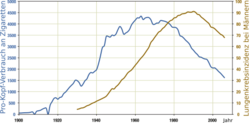 From 1965 to 2006, rates of smoking in the United States have declined from 42% to 20.8%.[38] A significant majority of those who quit were professional, affluent men. Despite this decrease in the prevalence of consumption, the average number of cigarettes consumed per person per day increased from 22 in 1954 to 30 in 1978. This paradoxical event suggests that those who quit smoked less, while those who continued to smoke moved to smoke more light cigarettes.[39] This trend has been paralleled by many industrialized nations as rates have either leveled-off or declined. In the developing countries, however, tobacco consumption continues to rise at 3.4% in 2002.[40] In Africa, smoking is in most areas considered to be modern, and many of the strong adverse opinions that prevail in the West receive much less attention.[41] Today Russia leads as the top consumer of tobacco followed by Indonesia, Laos, Ukraine , Belarus , Greece, Jordan, and China .[42]
