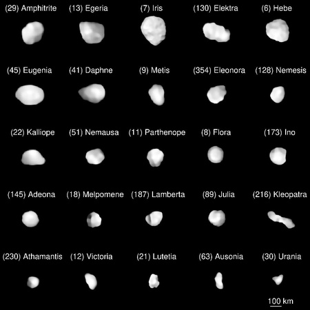 | 216 Kleopatra | 217×94 | April 10, 1880 | Metallic asteroid with "ham-bone" shape and 2 satellites |