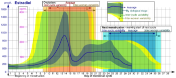 Reference ranges for the blood content of estradiol, the primary type of estrogen, during the menstrual cycle.