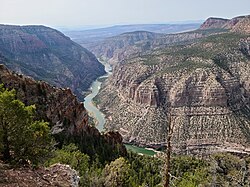 The Green River, located in the western United States, is the chief tributary of the Colorado River. The watershed of the river, known as the Green River Basin, covers parts of the U.S. states of Wyoming, Utah, and Colorado. The Green River is 730 miles (1,170 km) long, beginning in the Wind River Mountains of Wyoming and flowing through Wyoming and Utah for most of its course, except for a short segment of 40 miles (64 km) in western Colorado. Much of the route traverses the arid Colorado Plateau, where the river has carved some of the most spectacular canyons in the United States. The Green is slightly smaller than Colorado when the two rivers merge but typically carries a larger load of silt. The average yearly mean flow of the river at Green River, Utah is 6,121 cubic feet (173.3 m3) per second.[2]