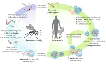 (5 & 6) Sandflies become infected during blood meals on infected hosts when they ingest macrophages infected with amastigotes.