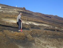 Tephra horizons in south-central Iceland. The thick and light-to-dark coloured layer at the height of the volcanologist's hands is a marker horizon of rhyolitic-to-basaltic tephra from Hekla.