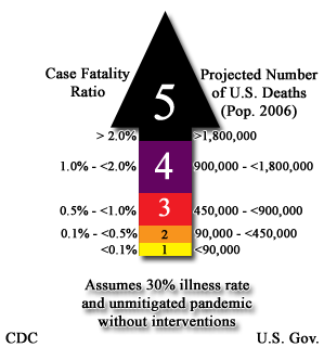 The index focuses less on how likely a disease will spread worldwide – that is, become a pandemic – and more upon how severe the epidemic actually is.[8] The main criterion used to measure pandemic severity will be case-fatality rate (CFR), the percentage of deaths out of the total reported cases of the disease.[3]The actual implementation of PSI alerts was expected to occur after the World Health Organization (WHO) announces phase 6 influenza transmission (human to human) in the United States. This would probably result in immediate announcement of a PSI level 3–4 situation.[3]