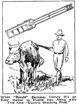 A cattle prod, also called a stock prod or a hot stick, is a handheld device commonly used to make cattle or other livestock move by striking or poking them. An electric cattle prod is a stick with electrodes on the end which is used to make cattle move via a relatively high-voltage, low-current electric shock. The electric cattle prod is said to have been invented by Texas cattle baron Robert J. Kleberg, Jr.[1][2] of the King Ranch around 1930, although versions were sold as early as 1917.