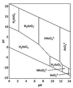 Pourbaix diagram showing the distribution of arsenate and arsenite species in water. Oxygenated waters have a high pe value and arsenate species dominate. In deoxygenated water, with low pe, arsenite species dominate.