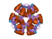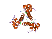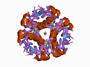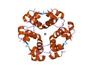Insulin is produced and stored in the body as a hexamer (a unit of six insulin molecules), while the active form is the monomer. The hexamer is about 36000 Da in size. The six molecules are linked together as three dimeric units to form symmetrical molecule. An important feature is the presence of zinc atoms (Zn2+) on the axis of symmetry, which are surrounded by three water molecules and three histidine residues at position B10.[13][42]