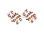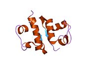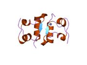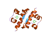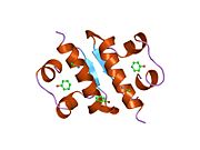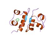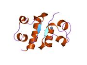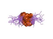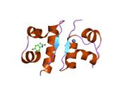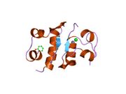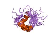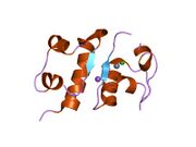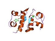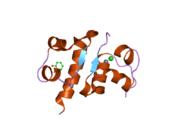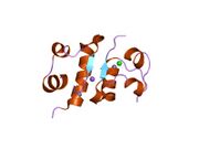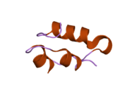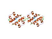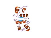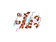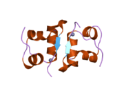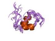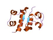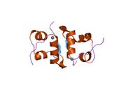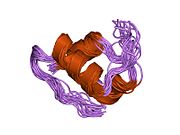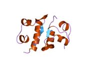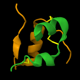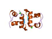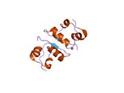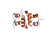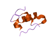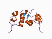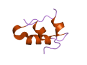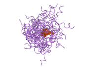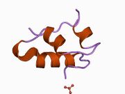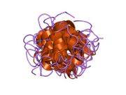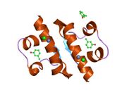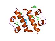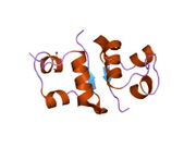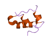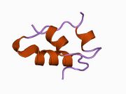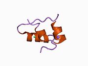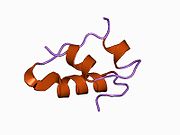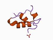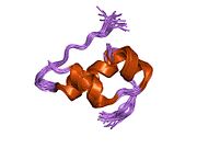 Contrary to an initial belief that hormones would be generally small chemical molecules, as the first peptide hormone known of its structure, insulin was found to be quite large.[13] A single protein (monomer) of human insulin is composed of 51 amino acids, and has a molecular mass of 5808 Da. The molecular formula of human insulin is C257H383N65O77S6.[41] It is a combination of two peptide chains (dimer) named an A-chain and a B-chain, which are linked together by two disulfide bonds. The A-chain is composed of 21 amino acids, while the B-chain consists of 30 residues. The linking (interchain) disulfide bonds are formed at cysteine residues between the positions A7-B7 and A20-B19. There is an additional (intrachain) disulfide bond within the A-chain between cysteine residues at positions A6 and A11. The A-chain exhibits two α-helical regions at A1-A8 and A12-A19 which are antiparallel; while the B chain has a central α -helix (covering residues B9-B19) flanked by the disulfide bond on either sides and two β-sheets (covering B7-B10 and B20-B23).[13][42]