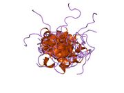 The hexamer is an inactive form with long-term stability, which serves as a way to keep the highly reactive insulin protected, yet readily available. The hexamer-monomer conversion is one of the central aspects of insulin formulations for injection. The hexamer is far more stable than the monomer, which is desirable for practical reasons; however, the monomer is a much faster-reacting drug because diffusion rate is inversely related to particle size. A fast-reacting drug means insulin injections do not have to precede mealtimes by hours, which in turn gives people with diabetes more flexibility in their daily schedules.[43] Insulin can aggregate and form fibrillar interdigitated beta-sheets. This can cause injection amyloidosis, and prevents the storage of insulin for long periods.[44]
