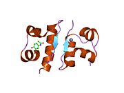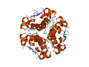 The structure of insulin. The left side is a space-filling model of the insulin monomer, believed to be biologically active. Carbon is green, hydrogen white, oxygen red, and nitrogen blue. On the right side is a ribbon diagram of the insulin hexamer, believed to be the stored form. A monomer unit is highlighted with the A chain in blue and the B chain in cyan. Yellow denotes disulfide bonds, and magenta spheres are zinc ions.