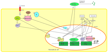NeuroD1, also known as β2, regulates insulin exocytosis in pancreatic β cells by directly inducing the expression of genes involved in exocytosis.[33] It is localized in the cytosol, but in response to high glucose it becomes glycosylated by OGT and/or phosphorylated by ERK, which causes translocation to the nucleus. In the nucleus β2 heterodimerizes with E47, binds to the E1 element of the insulin promoter and recruits co-activator p300 which acetylates β2. It is able to interact with other transcription factors as well in activation of the insulin gene.[33]