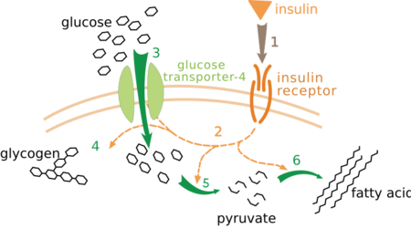 - Increased fat synthesis – insulin forces fat cells to take in blood glucose, which is converted into triglycerides; decrease of insulin causes the reverse.[67]