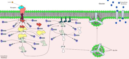 - Stimulates the uptake of glucose – Insulin decreases blood glucose concentration by inducing intake of glucose by the cells. This is possible because Insulin causes the insertion of the GLUT4 transporter in the cell membranes of muscle and fat tissues which allows glucose to enter the cell.[62]