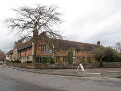 Student hostel, sometime house and Inn. Late C14 altered C16, clad C18. Timber framed and clad with painted brick and painted tile hanging on 1st floor. Plain tiled roof. Two storeys, basement and garret, with plinth, continuous moulded bressumer, the ground floor recessed to right 3 bays with jetty on brackets. Moulded wooden eaves cornice to hipped roof, with stacks to centre left and to right, and hipped dormer to left return. Five glazing bar sashes on 1st floor, and 2 to left on ground floor, with 3 wooden casements to right. Central door of 4 panels and 3 steps, and panelled door to right with 2 steps. Basement openings to centre. Left return (to High Street) with roof stepped down to rear range with stack at end left. Wooden casement and glazing bar sash on 1st floor, 3 wooden casements on ground floor. Panelled corner door with pilastered surround and flat hood. Single storey weather boarded block at extreme left (eastern end), with half-hipped plain tiled roof and half-doors in gable end. Catslide outshot and 2 hipped wings to rear. Interior: extremely rare survival of coved dais canopy, with evidence of colouring, unaltered when open hall floored C16. Crown post roof.