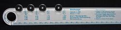A ruler, sometimes called a rule, line gauge, or scale, is an instrument used to make distance measurements whereby a user estimates a distance by reading from a series of markings called "rules" along an edge of the device.[1] Commonly the instrument is rigid and the edge itself is a straightedge ("ruled straightedge") which additionally allows one to draw straight lines. Some rulers such as cloth or paper tape measures are non-rigid. Specialty rulers exist that have flexible edges that retain a chosen shape and these find use in sewing, arts, and crafts.