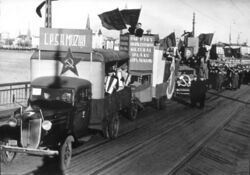 Ulmanis' government resigned and was replaced by a left-wing government created under instructions from the USSR embassy. Up until the election of the People's Parliament on July 14–15, 1940 there were no public statements about governmental plans to introduce a Soviet political order or to join the Soviet Union. Soon after the occupation, the Communist Party of Latvia was legalized as the only legal party and presented the "Working People's Bloc" for the elections.[9] It was the only permitted participant in the election, after an attempt by other politicians to include the Democratic Bloc (an alliance of all banned Latvian parties, except the Social Democratic Workers' Party) on the ballot was prevented by the government. Its office was closed, election leaflets confiscated and its leaders arrested.[10]