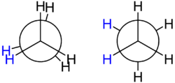 The spatial arrangement of the C-C and C-H bonds are described by the torsion angles of the molecule is known as its conformation. In ethane, the simplest case for studying the conformation of alkanes, there is nearly free rotation about a carbon–carbon single bond. Two limiting conformations are important: eclipsed conformation and staggered conformation. The staggered conformation is 12.6 kJ/mol (3.0 kcal/mol) lower in energy (more stable) than the eclipsed conformation (the least stable). In highly branched alkanes, the bond angle may differ from the optimal value (109.5°) to accommodate bulky groups. Such distortions introduce a tension in the molecule, known as steric hindrance or strain. Strain substantially increases reactivity..[22]