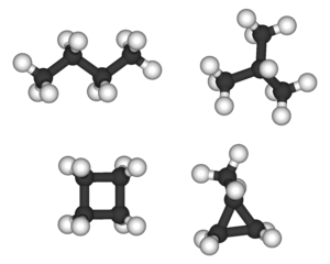 Branched alkanes can be chiral. For example, 3-methylhexane and its higher homologues are chiral due to their stereogenic center at carbon atom number 3. The above list only includes differences of connectivity, not stereochemistry. In addition to the alkane isomers, the chain of carbon atoms may form one or more rings. Such compounds are called cycloalkanes, and are also excluded from the above list because changing the number of rings changes the molecular formula. For example, cyclobutane and methylcyclopropane are isomers of each other (C4H8), but are not isomers of butane (C4H10).