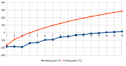 Under standard conditions, from CH4 to C4H10 alkanes are gaseous; from C5H12 to C17H36 they are liquids; and after C18H38 they are solids. As the boiling point of alkanes is primarily determined by weight, it should not be a surprise that the boiling point has an almost linear relationship with the size (molecular weight) of the molecule. As a rule of thumb, the boiling point rises 20–30 °C for each carbon added to the chain; this rule applies to other homologous series.[18]