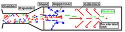 William Barr and Ralph Moir then ran a group which did a series of direct energy conversion experiments through the late 1970s and early 1980s.[6] The first experiments used beams of positives and negatives as fuel, and demonstrated energy capture at a peak efficiency of 65 percent and a minimum efficiency of 50 percent.[7][8] The following experiments involved a true plasma direct converter that was tested on the Tandem Mirror Experiment (TMX), an operating magnetic mirror fusion reactor. In the experiment, the plasma moved along diverging field lines, spreading it out and converting it into a forward moving beam with a Debye length of a few centimeters.[9] Suppressor grids then reflect the electrons, and collector anodes recovered the ion energy by slowing them down and collecting them at high-potential plates. This machine demonstrated an energy capture efficiency of 48 percent.[10] However, Marshall Rosenbluth argued that keeping the plasma's neutral charge over the very short Debye length distance would be very challenging in practice, though he said that this problem would not occur in every version of this technology.[9]