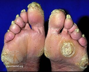 Diffuse palmoplantar keratoderma is a type of palmoplantar keratoderma that is characterized by an even, thick, symmetric hyperkeratosis over the whole of the palm and sole, usually evident at birth or in the first few months of life.[2]: 505 Restated, diffuse palmoplantar keratoderma is an autosomal dominant disorder in which hyperkeratosis is confined to the palms and soles.[5] The two major types can have a similar clinical appearance:[5]