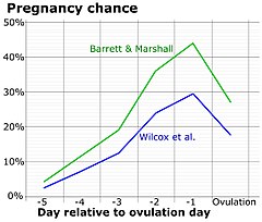 Timing intercourse with a person's estimated 'fertile window' is a practice sometimes called 'timed intercourse'.[28] The effectiveness of timed intercourse is not entirely clear, however, timed intercourse using urine tests that predict ovulation may help improve the rate of pregnancy and live births for some couples trying to conceive such as those who have been trying for less than 12-months and who are under 40 years old.[28] It is not clear from medical evidence if timed intercourse improves the rate of ultra-sound confirmed pregnancies and it is also not clear if timed intercourse has an effect on a person's level of stress or their quality of life.[28] Pregnancy rates for sexual intercourse are also affected by several other factors. Regarding frequency, there are recommendations of sexual intercourse every 1 or 2 days,[29] or every 2 or 3 days.[30] Studies have shown no significant difference between different sex positions and pregnancy rate, as long as it results in ejaculation into the vagina.[31] Social science research has found that timing intercourse can become a gendered 'chore' in heterosexual married couples trying to conceive, with women tracking their ovulation cycles and dictating to their husbands when they should have sexual intercourse.[32]