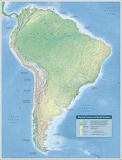 South America occupies the southern portion of the Americas. The continent is generally delimited on the northwest by the Darién watershed along the Colombia–Panama border, although some may consider the border instead to be the Panama Canal. Geopolitically[49] and geographically, all of Panama – including the segment east of the Panama Canal in the isthmus – is typically included in North America alone[50][51][52] and among the countries of Central America.[53][54] Almost all of mainland South America sits on the South American Plate.