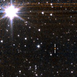 The cold planetary-mass object WISE J0830+2837 (marked orange object) observed with the Spitzer Space Telescope. It has a temperature of 300-350 K (27-77°C; 80-170 °F)