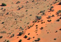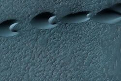 A type of extensive parabolic dune that lacks discernible slipfaces and has mostly coarse grained sand is known as a zibar.[28] The term zibar comes from the Arabic word to describe "rolling transverse ridges ... with a hard surface".[29] The dunes are small, have low relief, and can be found in many places across the planet from Wyoming (United States) to Saudi Arabia to Australia.[30] Spacing between zibars ranges from 50 to 400 metres and they don't become more than 10 metres high.[31] The dunes form at about ninety degrees to the prevailing wind which blows away the small, fine-grained sand leaving behind the coarser grained sand to form the crest.[32]