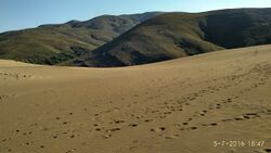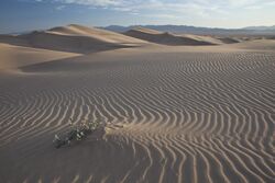 A universally precise distinction does not exist between ripples, dunes, and a draa,[21] which are all deposits of the same type of materials. Dunes are generally defined as greater than 7 cm tall and may have ripples, while ripples are deposits that are less than 3 cm tall.[22] A draa is a very large eolian landform, with a length of several kilometers and a height of tens to hundreds of meters, and which may have superimposed dunes.[23]