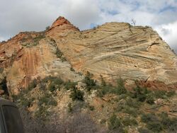 A lithified (consolidated) sand dune is a type of sandstone that is formed when a marine or aeolian sand dune becomes compacted and hardened. Once in this form, water passing through the rock can carry and deposit minerals, which can alter the color of the rock. Cross-bedded layers of stacks of lithified dunes can produce the cross-hatching patterns, such as those seen in Zion National Park in the western United States.