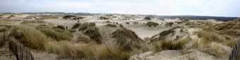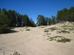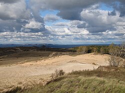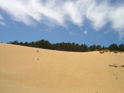Coastal dunes[35] form when wet sand is deposited along the coast and dries out and is blown along the beach.[36] Dunes form where the beach is wide enough to allow for the accumulation of wind-blown sand, and where prevailing onshore winds tend to blow sand inland. The three key ingredients for coastal dune formation are a large sand supply, winds to move said sand supply, and a place for the sand supply to accumulate.[37] Obstacles—for example, vegetation, pebbles and so on—tend to slow down the wind and lead to the deposition of sand grains.[38] These small "incipient dunes or "shadow dunes" tend to grow in the vertical direction if the obstacle slowing the wind can also grow vertically (i.e., vegetation). Coastal dunes expand laterally as a result of lateral growth of coastal plants via seed or rhizome.[39][40] Models of coastal dunes suggest that their final equilibrium height is related to the distance between the water line and where vegetation can grow.[41] Coastal dunes can be classified by where they develop, or begin to take shape. Dunes are commonly grouped into either the Primary Dune Group or the Secondary Dune Group.[35] Primary dunes gain most of their sand from the beach itself, while secondary dunes gain their sand from the primary dune. Along the Florida Panhandle, most dunes are considered to be foredunes or hummocks.[42][43] Different locations around the globe have dune formations unique to their given coastal profile.