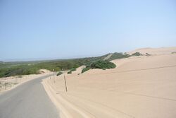 Some coastal areas have one or more sets of dunes running parallel to the shoreline directly inland from the beach. In most cases, the dunes are important in protecting the land against potential ravages by storm waves from the sea.[16] Artificial dunes are sometimes constructed to protect coastal areas.[17][18] The dynamic action of wind and water can sometimes cause dunes to drift, which can have serious consequences. For example, the town of Eucla, Western Australia, had to be relocated in the 1890s because of dune drift.[19]