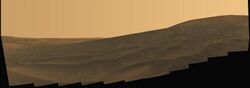 Titan's dunes include large expanses with modal lengths of about 20–30 km. The regions are not topographically confined, resembling sand seas. These dunes are interpreted to be longitudinal dunes whose crests are oriented parallel to the dominant wind direction, which generally indicates west-to-east wind flow. The sand is likely composed of hydrocarbon particles, possibly with some water ice mixed in.[74]