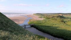 Dunes are most common in desert environments, where the lack of moisture hinders the growth of vegetation that would otherwise interfere with the development of dunes. However, sand deposits are not restricted to deserts, and dunes are also found along sea shores, along streams in semiarid climates, in areas of glacial outwash, and in other areas where poorly cemented sandstone bedrock disintegrates to produce an ample supply of loose sand.[13] Subaqueous dunes can form from the action of water flow (fluvial processes) on sand or gravel beds of rivers, estuaries, and the sea-bed.[14][15]