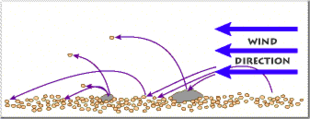 Sand dunes can have a negative impact on humans when they encroach on human habitats. Sand dunes move via a few different means, all of them helped along by wind. One way that dunes can move is by saltation, where sand particles skip along the ground like a bouncing ball. When these skipping particles land, they may knock into other particles and cause them to move as well, in a process known as creep. With slightly stronger winds, particles collide in mid-air, causing sheet flows. In a major dust storm, dunes may move tens of metres through such sheet flows. Also as in the case of snow, sand avalanches, falling down the slipface of the dunes—that face away from the winds—also move the dunes forward.