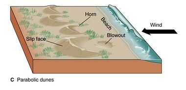 Parabolic dunes, like crescent dunes, occur in areas where very strong winds are mostly unidirectional. Although these dunes are found in areas now characterized by variable wind speeds, the effective winds associated with the growth and migration of both the parabolic and crescent dunes probably are the most consistent in wind direction.