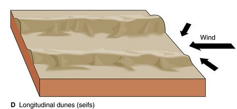 Seif dunes are associated with bidirectional winds. The long axes and ridges of these dunes extend along the resultant direction of sand movement (hence the name "longitudinal").[26] Some linear dunes merge to form Y-shaped compound dunes.[24]