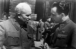 In October 1964, Khrushchev was deposed by a joint Central Committee and Politburo plenum and succeeded by another collective leadership, this time led by Leonid Brezhnev, born in Ukraine, as First Secretary and Alexei Kosygin as Chairman of the Council of Ministers.[25] Brezhnev's rule would be marked by social and economic stagnation, a period often referred to as the Era of Stagnation.[26] The new regime introduced the policy of rastsvet, sblizhenie and sliianie ("flowering", "drawing together" and "merging"/"fusion"), which was the policy of uniting the different Soviet nationalities into one Soviet nationality by merging the best elements of each nationality into the new one. This policy turned out to be, in fact, the reintroduction of the russification policy.[27] The reintroduction of this policy can be explained by Khrushchev's promise of communism in 20 years; the unification of Soviet nationalities would take place, according to Vladimir Lenin, when the Soviet Union reached the final stage of communism, also the final stage of human development. Some all-Union Soviet officials were calling for the abolition of the "pseudosovereign" Soviet republics, and the establishment of one nationality. Instead of introducing the ideologic concept of the Soviet Nation, Brezhnev at the 24th Party Congress talked about "a new historical community of people – the Soviet people",[27] and introduced the ideological tenant of Developed socialism, which postponed communism.[28] When Brezhnev died in 1982, he was succeeded by Yuri Andropov, who died quickly after taking power. Andropov was succeeded by Konstantin Chernenko, who ruled for little more than a year. Chernenko was succeeded by Mikhail Gorbachev in 1985.[29]