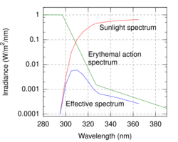 The differential effects of various wavelengths of light on the human cornea and skin are sometimes called the "erythemal action spectrum".[57] The action spectrum shows that UVA does not cause immediate reaction, but rather UV begins to cause photokeratitis and skin redness (with lighter skinned individuals being more sensitive) at wavelengths starting near the beginning of the UVB band at 315 nm, and rapidly increasing to 300 nm. The skin and eyes are most sensitive to damage by UV at 265–275 nm, which is in the lower UV‑C band. At still shorter wavelengths of UV, damage continues to happen, but the overt effects are not as great with so little penetrating the atmosphere. The WHO-standard ultraviolet index is a widely publicized measurement of total strength of UV wavelengths that cause sunburn on human skin, by weighting UV exposure for action spectrum effects at a given time and location. This standard shows that most sunburn happens due to UV at wavelengths near the boundary of the UV‑A and UV‑B bands.