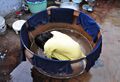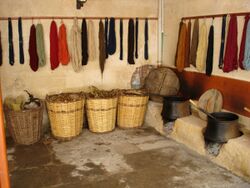 Archaeologists have found evidence of textile dyeing dating back to the Neolithic period. In China, dyeing with plants, barks and insects has been traced back more than 5,000 years.[2] The essential process of dyeing changed little over time. Typically, the dye material is put in a pot of water and heated to extract the dye compounds into solution with the water. Then the textiles to be dyed are added to the pot, and held at heat until the desired color is achieved. Textile fibre may be dyed before spinning or weaving ("dyed in the wool"), after spinning ("yarn-dyed") or after weaving ("piece-dyed").[3] Many natural dyes require the use of substances called mordants to bind the dye to the textile fibres. Mordants (from la mordere 'to bite') are metal salts that can form a stable molecular coordination complex with both natural dyes and natural fibres. Historically, the most common mordants were alum (potassium aluminum sulfate—a metal salt of aluminum) and iron (ferrous sulfate). Many other metal salt mordants were also used, but are seldom used now due to modern research evidence of their extreme toxicity either to human health, ecological health, or both. These include salts of metals such as chrome, copper, tin, lead, and others. In addition, a number of non-metal salt substances can be used to assist with the molecular bonding of natural dyes to natural fibres—either on their own, or in combination with metal salt mordants—including tannin from oak galls and a range of other plants/plant parts, "pseudo-tannins", such as plant-derived oxalic acid, and ammonia from stale urine. Plants that bio-accumulate aluminum have also been used. Some mordants, and some dyes themselves, produce strong odors, and large-scale dyeworks were often isolated in their own districts.