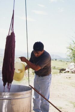 A delicate rose color in Navajo rugs comes from fermented prickly pear cactus fruit, Opuntia polyacantha.[30] Navajo weavers also use rainwater and red dirt to create salmon-pink dyes.[31]