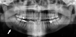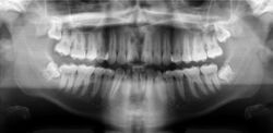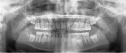 A dental panoramic radiograph, showing the maxilla and mandible, all the teeth including the "wisdom teeth," the frontal and maxillary sinuses, the nasal cavity and the temporomandibular joint and other near by head and neck anatomy. | |