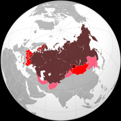 Bolshevik leaders had effectively reestablished a polity with roughly the same extent as that empire by 1921, however with an internationalist ideology: Lenin in particular asserted the right to limited self-determination for national minorities within the new territory.[134] Beginning in 1923, the policy of "Indigenization" [korenizatsiya] was intended to support non-Russians develop their national cultures within a socialist framework. Never formally revoked, it stopped being implemented after 1932. After World War II, the Soviet Union installed socialist regimes modeled on those it had installed in 1919–20 in the old Russian Empire, in areas its forces occupied in Eastern Europe.[135] The Soviet Union and later the People's Republic of China supported revolutionary and communist movements in foreign nations and colonies to advance their own interests, but were not always successful.[136] The USSR provided great assistance to Kuomintang in 1926–1928 in the formation of a unified Chinese government (see Northern Expedition). Although then relations with the USSR deteriorated, but the USSR was the only world power that provided military assistance to China against Japanese aggression in 1937–1941 (see Sino-Soviet Non-Aggression Pact). The victory of the Chinese Communists in the civil war of 1946–1949 relied on the great help of the USSR (see Chinese Civil War).