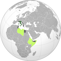 Outside Africa, Italy possessed the Dodecanese Islands off the coast of Turkey (following the Italo-Turkish War) and a small concession in Tianjin in China following the Boxer War of 1900. During the First World War, Italy occupied southern Albania to prevent it from falling to Austria-Hungary. In 1917, it established a protectorate over Albania, which remained in place until 1920.[122] The Fascist government that came to power with Benito Mussolini in 1922 sought to increase the size of the Italian empire and to satisfy the claims of Italian irredentists. After its second invasion of Ethiopia in 1936, Italy occupied Ethiopia until 1941.The Italian Empire is generally considered to have reached its greatest territorial extent between 1936 and 1940, following the conquest of Ethiopia and the proclamation of Italian East Africa. During this period, Italy controlled Libya, Eritrea, Italian Somaliland, Ethiopia (as part of Italian East Africa), the Dodecanese Islands, and Albania, in addition to smaller concessions elsewhere.The Italian colonial project under Fascism was justified by a combination of nationalism, irredentism, and a so-called civilizing mission. The regime promoted the spread of Italian language, culture, and institutions in its colonies, presenting colonial expansion as a way to assert Italy's prestige and modernize the territories under its control. Italian authorities established administrative structures and educational institutions in the colonies to govern local populations and train an elite loyal to Italy. Schools for Italian settlers and selected local students were created, with curricula modeled on the Italian system, aiming to integrate the colonies culturally and politically into the empire. At its peak, the Italian Empire covered several million square kilometers in Africa and the Mediterranean, ruling over millions of inhabitants. This period coincided with the broader maximum territorial extent of the European imperial powers during the interwar years. In 1939, Italy invaded Albania and incorporated it into the Fascist state. During the Second World War (1939–1945), Italy occupied British Somaliland, parts of south-eastern France, western Egypt and most of Greece, but then lost those conquests and its African colonies, including Ethiopia, to the invading allied forces by 1943. It was forced in the peace treaty of 1947 to relinquish sovereignty over all its colonies. It was granted a trust to administer former Italian Somaliland under United Nations supervision in 1950. When Somalia became independent in 1960, Italy's eight-decade experiment with colonialism ended.[123][124]