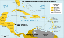 Spanish imperialism in the colonial era corresponds with the rise and decline of the Spanish Empire, conventionally recognized as emerging in 1402 with the conquest of the Canary Islands. Following the successes of exploratory maritime voyages conducted during the Age of Discovery, Spain committed considerable financial and military resources towards developing a robust navy capable of conducting large-scale, transatlantic expeditionary operations in order to establish and solidify a firm imperial presence across large portions of North America, South America, and the geographic regions comprising the Caribbean basin. Concomitant with Spanish endorsement and sponsorship of transatlantic expeditionary voyages was the deployment of Conquistadors, which further expanded Spanish imperial boundaries through the acquisition and development of territories and colonies.[156]