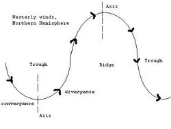 In the mid-latitude westerlies, upper level troughs and ridges often alternate in a high-amplitude pattern. For a trough in the westerlies, the region just west of the trough axis is typically an area of convergent winds and descending air – and hence high pressure –, while the region just east of the trough axis is an area of fast, divergent winds and low pressure. Tropical waves are a type of trough in easterly currents, a cyclonic northward deflection of the trade winds.
