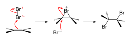 An old qualitative test for the presence of the alkene functional group is that alkenes turn brown aqueous bromine solutions colourless, forming a bromohydrin with some of the dibromoalkane also produced. The reaction passes through a short-lived strongly electrophilic bromonium intermediate. This is an example of a halogen addition reaction.[46]