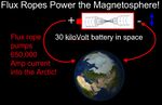 In 2007, THEMIS "found evidence of magnetic ropes connecting Earth's upper atmosphere directly to the Sun", reconfirming the theory of solar-terrestrial electrical interaction (via "Birkeland currents" or "field-aligned currents") proposed by Kristian Birkeland circa 1908.[10][11] NASA also likened the interaction to a "30 kiloVolt battery in space", noting the "flux rope pumps 650,000 Ampere current into the Arctic!"[12]